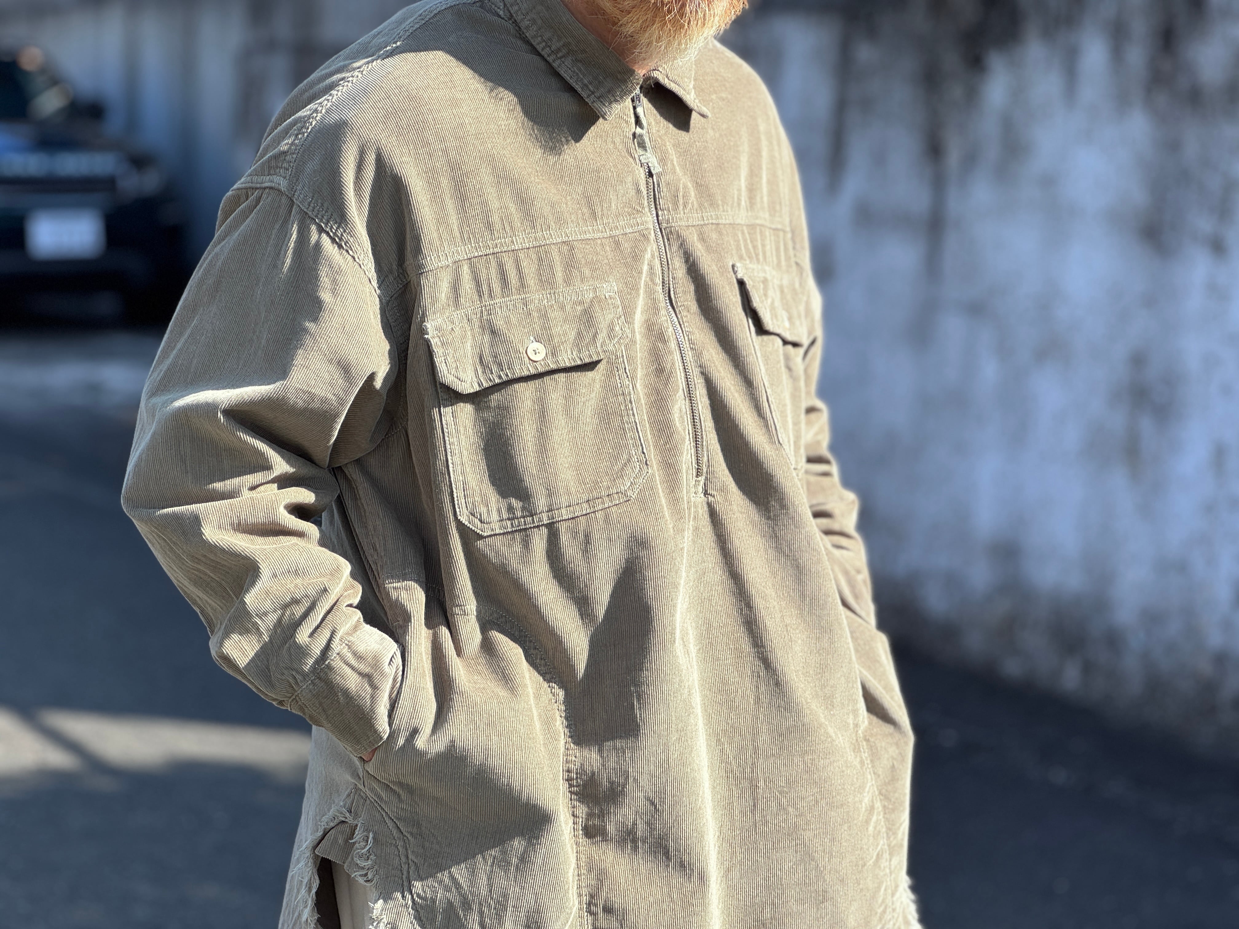 カラーはグレーカーキ。ハーフジップのプルオーバー、大きめなスラッシュポケット、裾がフリンジ。