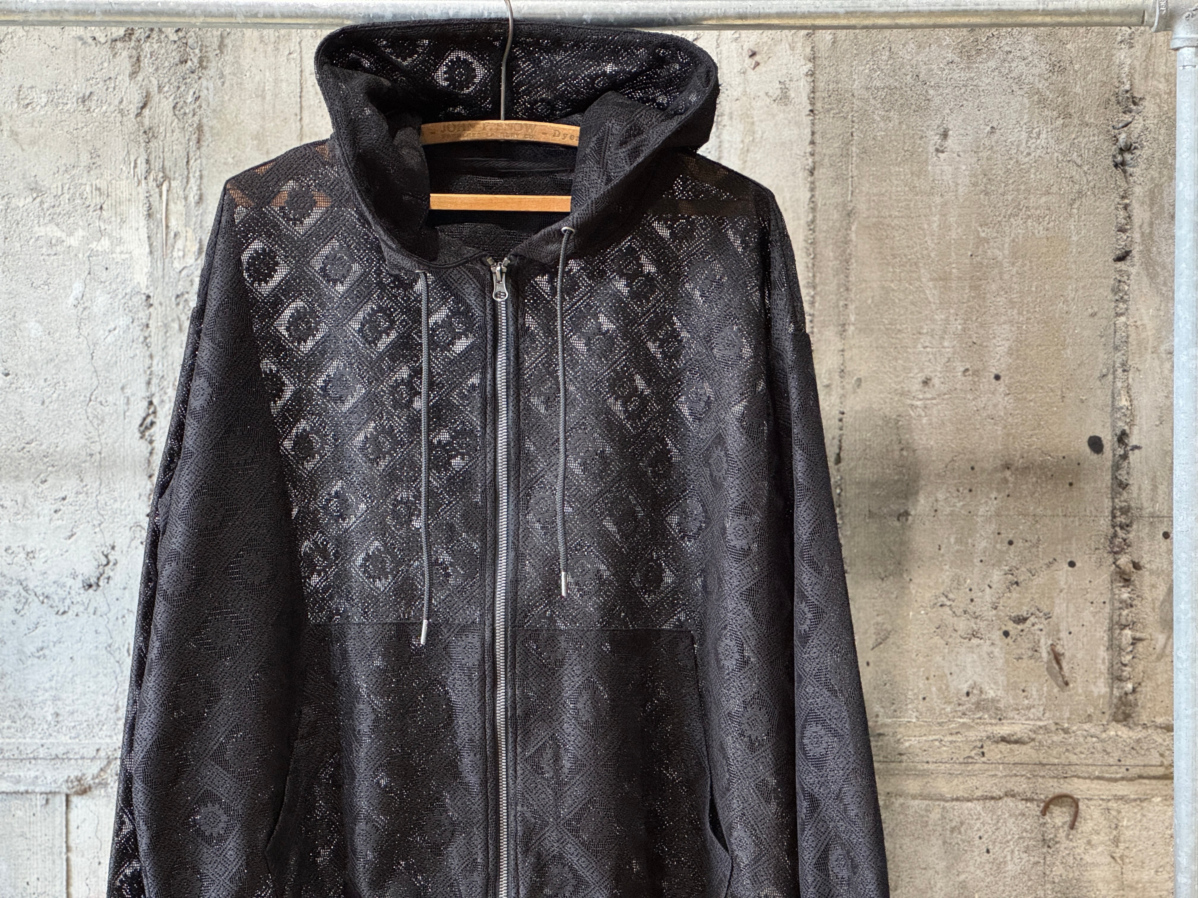 レース編みでパターンを施したジップアップパーカー。