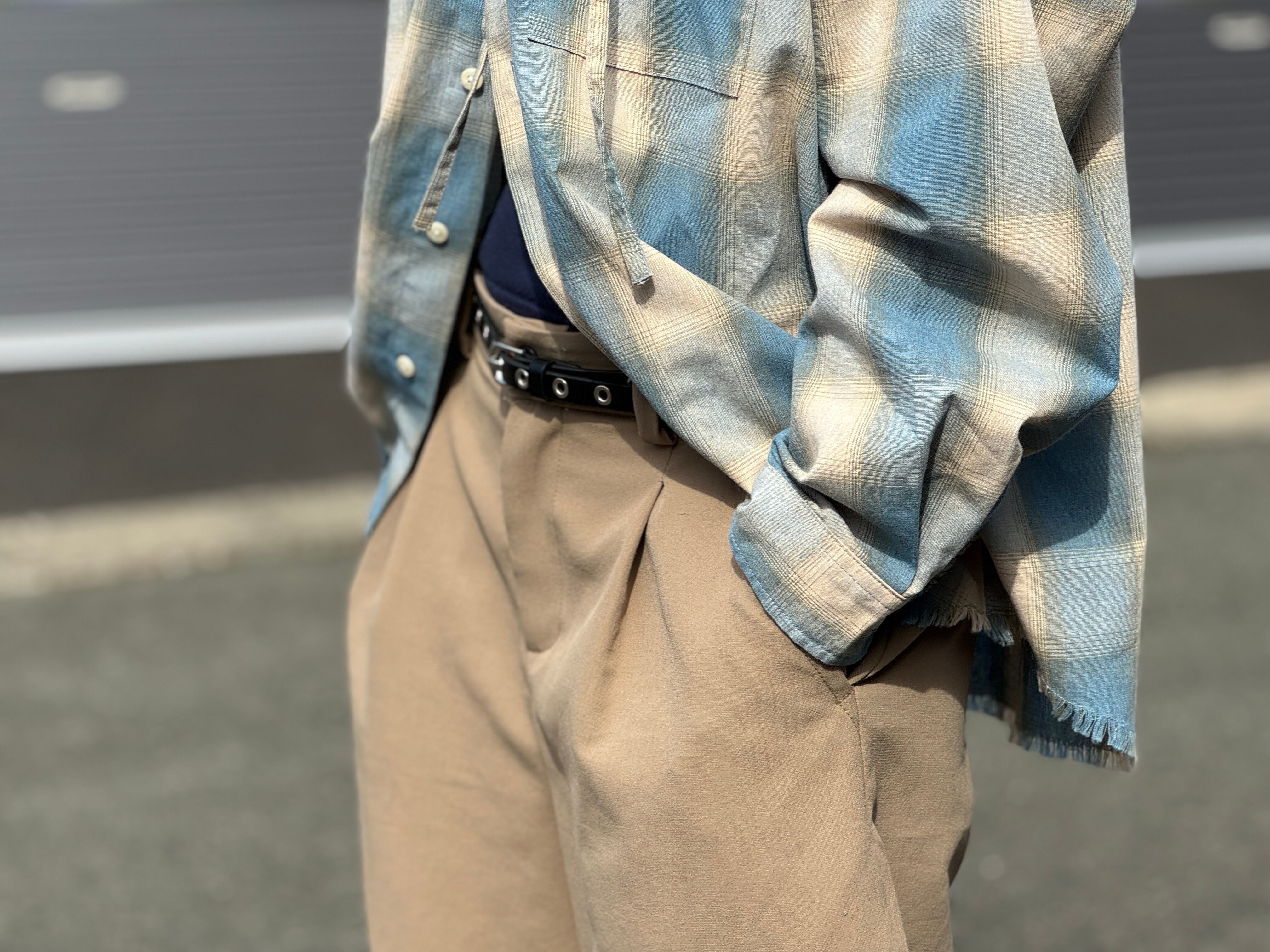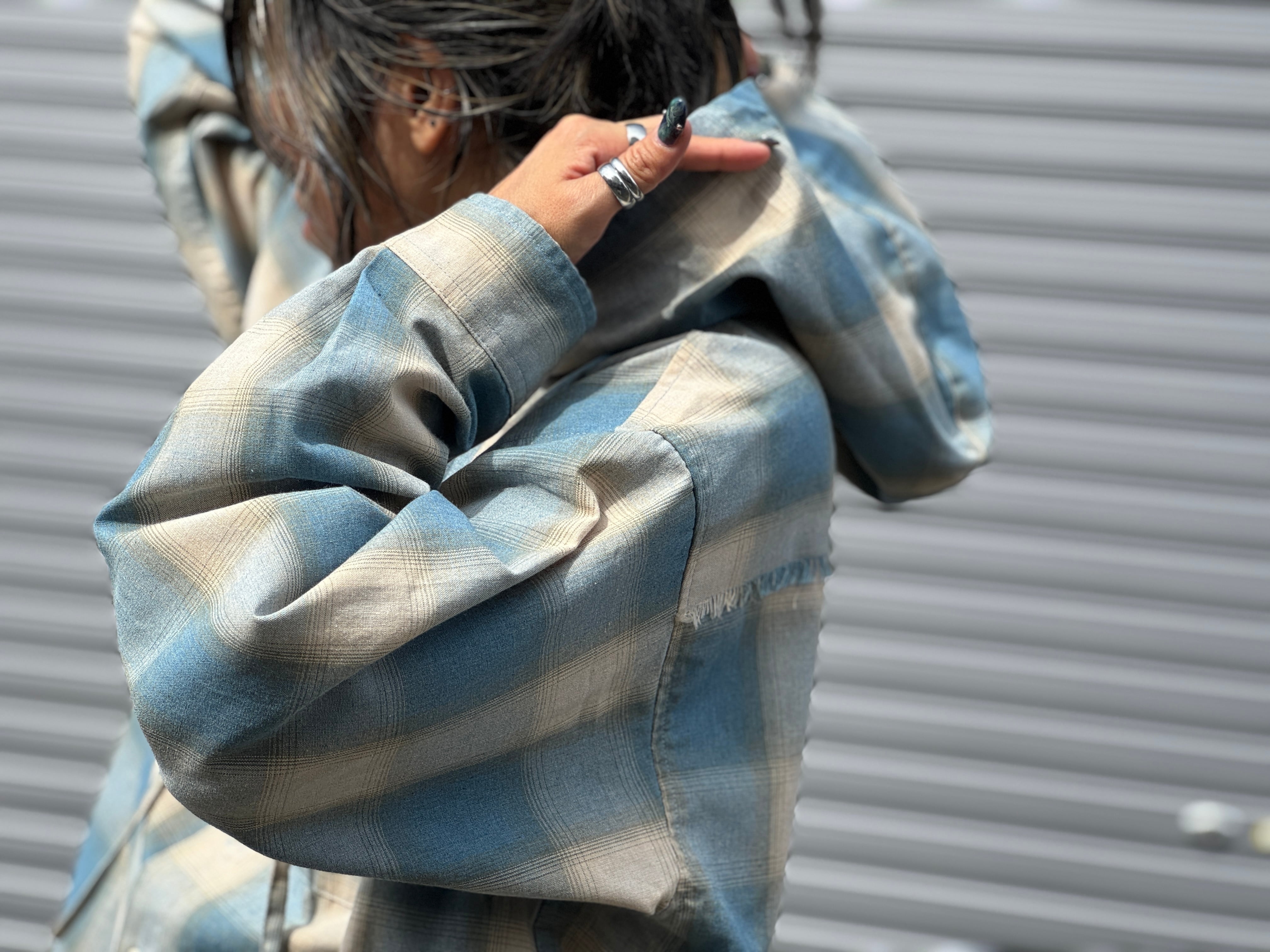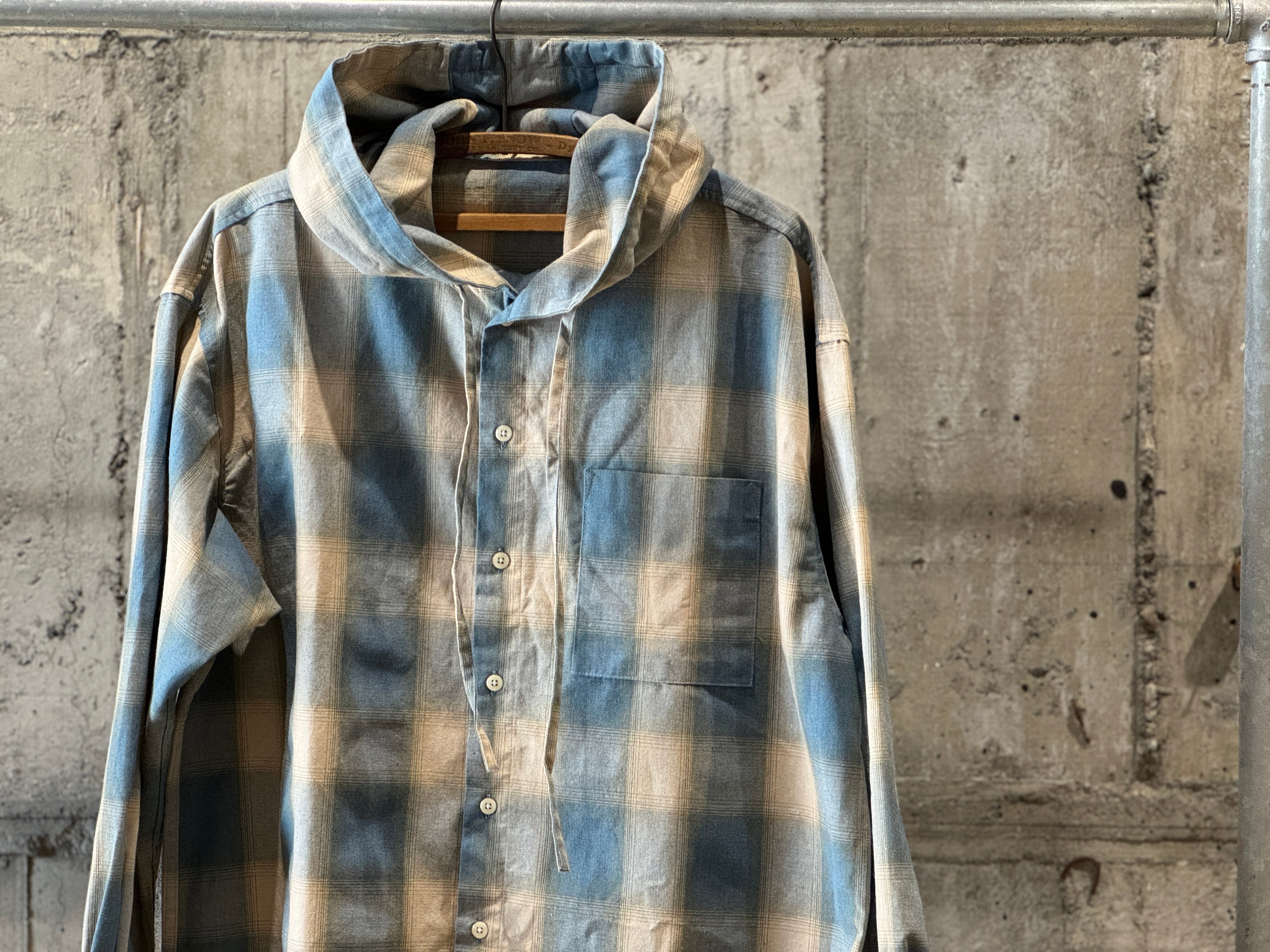 コチラは女性のお客さんからも好評いただいているオンブレチェックのフードシャツ。