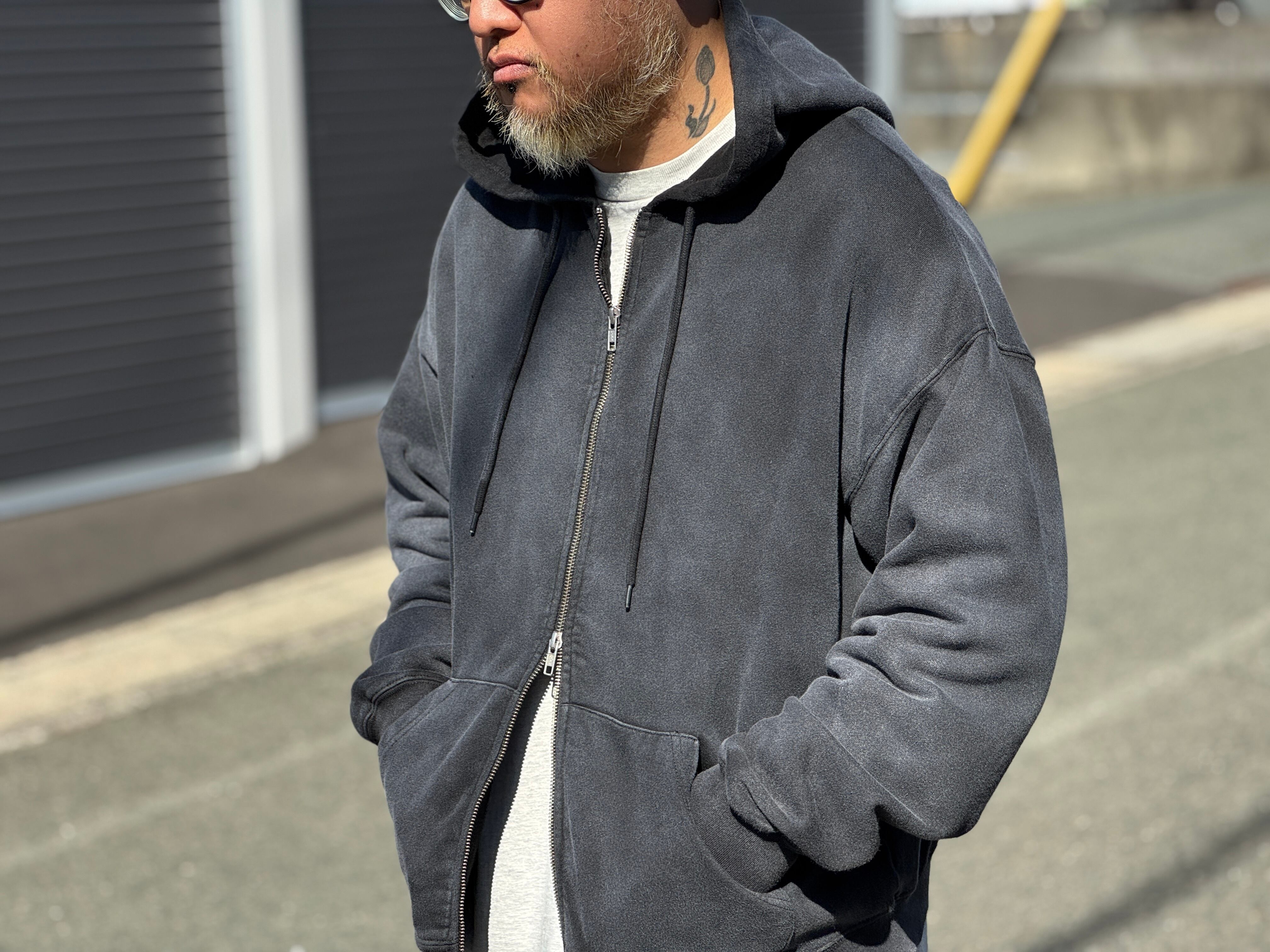Sunburned sweat zipup parka 2025.10.29 TシャツやロンT,シャツの上に丁度良い羽織。 楽だけど、シルエットがかなり計算されています。 短丈過ぎずなワイドなボックスシルエット。 このサンバーンド加工のムラ感も良し。w-zipも個人的には欠かせないディテールデザインの1つ。 Sunburned sweat zipup parka